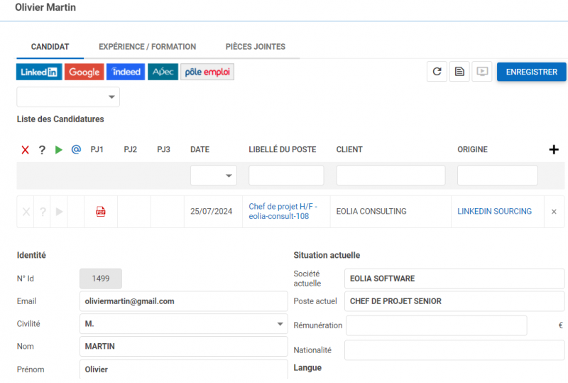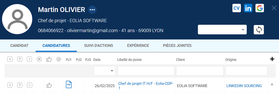 La fiche du candidat se crée automatiquement en reprenant les informations du profil, le rattachement au poste et l’affectation de l’origine :