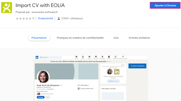 - Cliquer sur le lien : https://chromewebstore.google.com/detail/import-cv-with-eolia/agpaepdnhhekimehgfgppfomjndffmkk