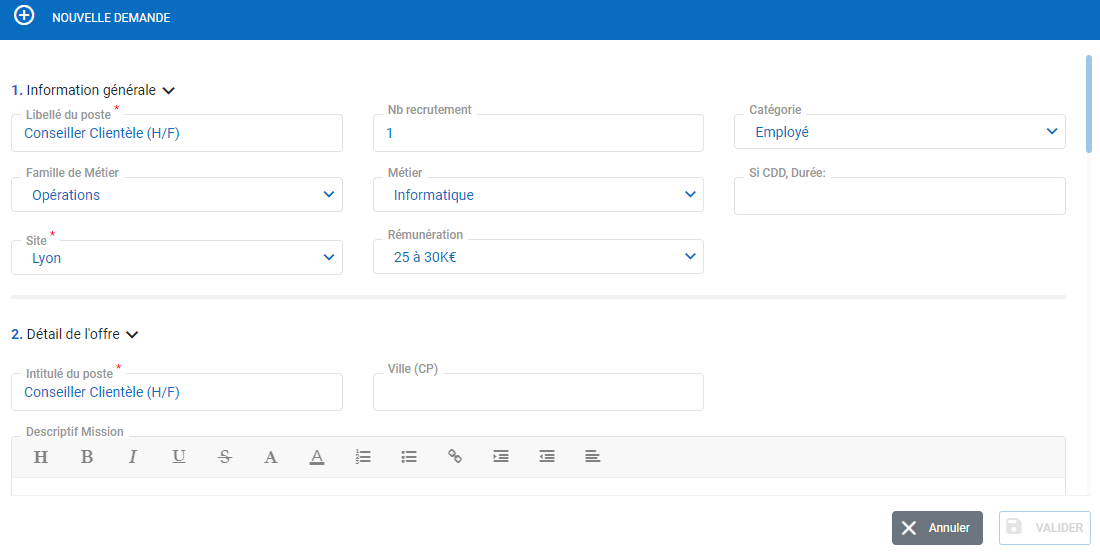 - Les informations sont pré-complétées selon le modèle créé sur le portail recruteur.