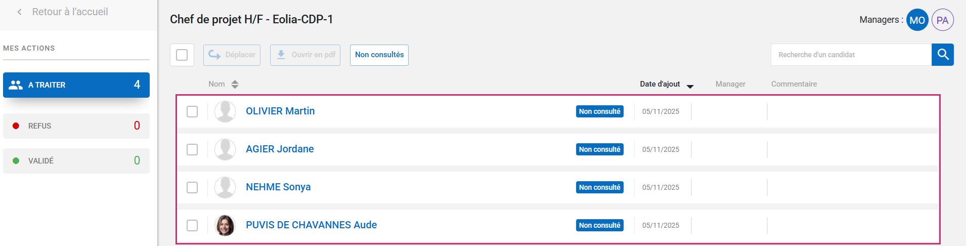 Pour consulter une ou plusieurs candidature(s), cliquer sur le poste en cours, puis sur le nom du candidat :
