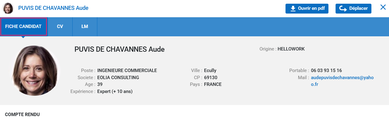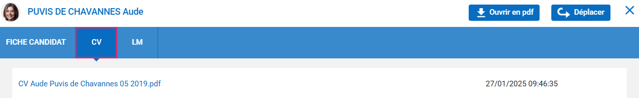 L’onglet CV vous affiche la pièce jointe du candidat :