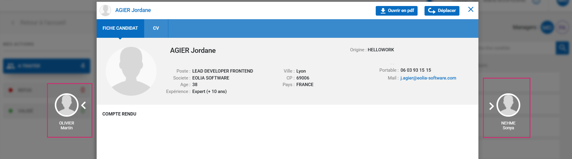 Vous pouvez également afficher la candidature Suivante ou Précédente, en cliquant sur les boutons indiqués sur l’image suivante :