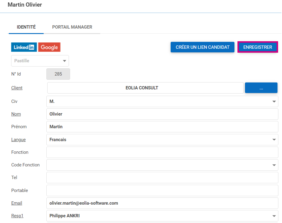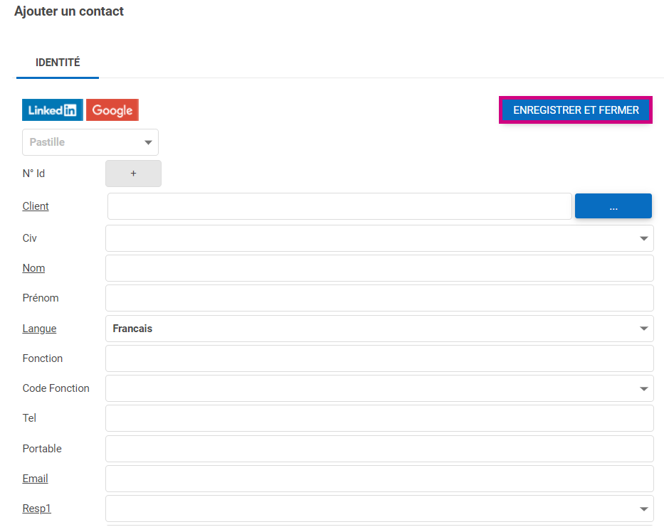 - Puis vous renseignez les informations de l’interlocuteur, et vous cliquez sur le bouton Enregistrer et Fermer.
