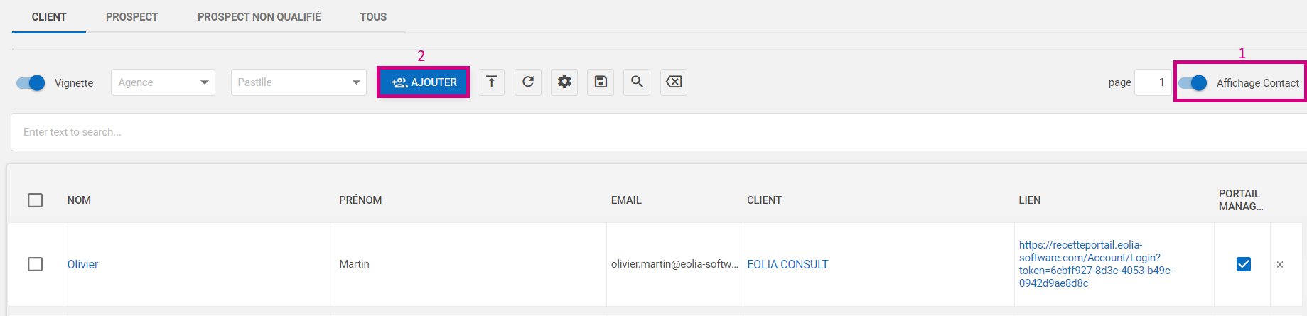 Affichage Contact, puis sur le bouton Ajouter :