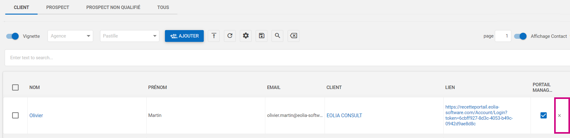 - À partir de la grille des contacts, en cliquant sur le bouton x :