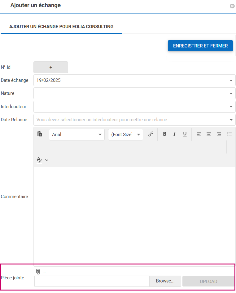 Pour attacher une pièce jointe à un échange vous cliquez sur la fiche client, puis vous cliquez sur l’échange sur l’onglet « Échanges », ensuite vous attachez la pièce jointe et vous cliquez sur le bouton Upload :
