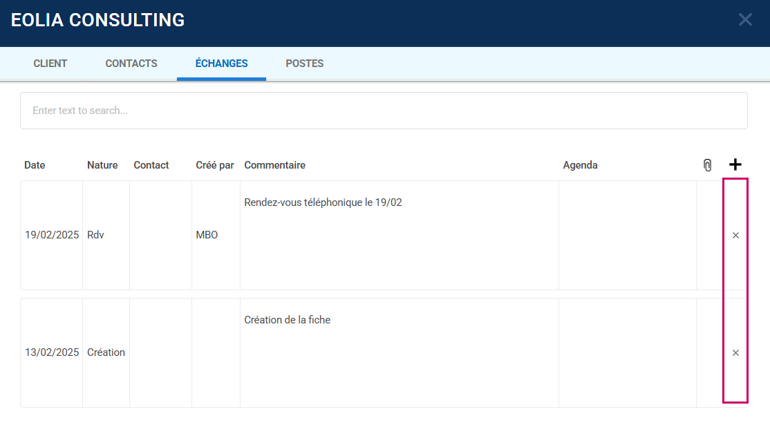Pour supprimer un échange, vous cliquez sur la fiche client, puis vous cliquez sur le bouton x sur l’onglet « Échanges » :