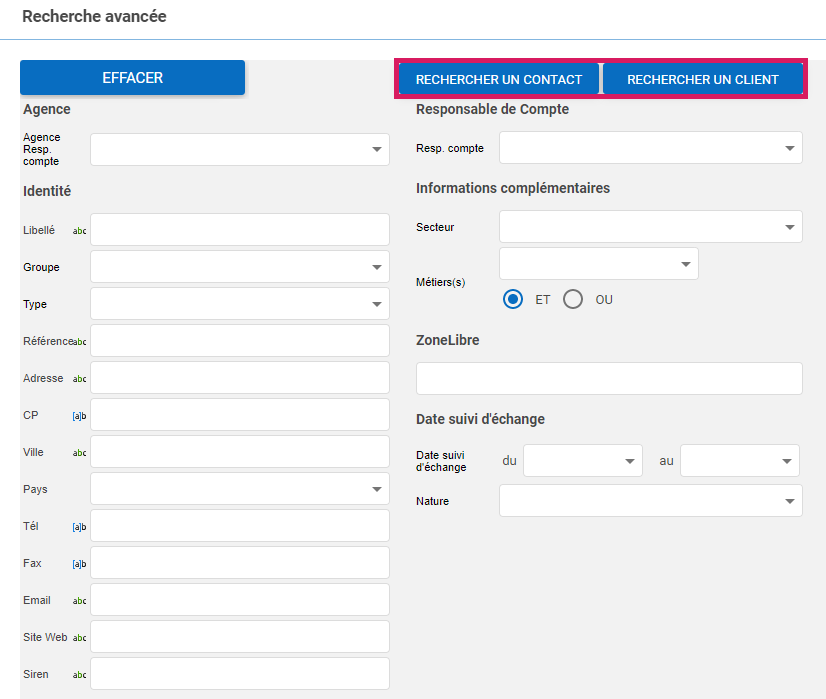 Ensuite vous renseignez vos critères, puis vous cliquez sur le bouton Rechercher un client ou Rechercher un contact :