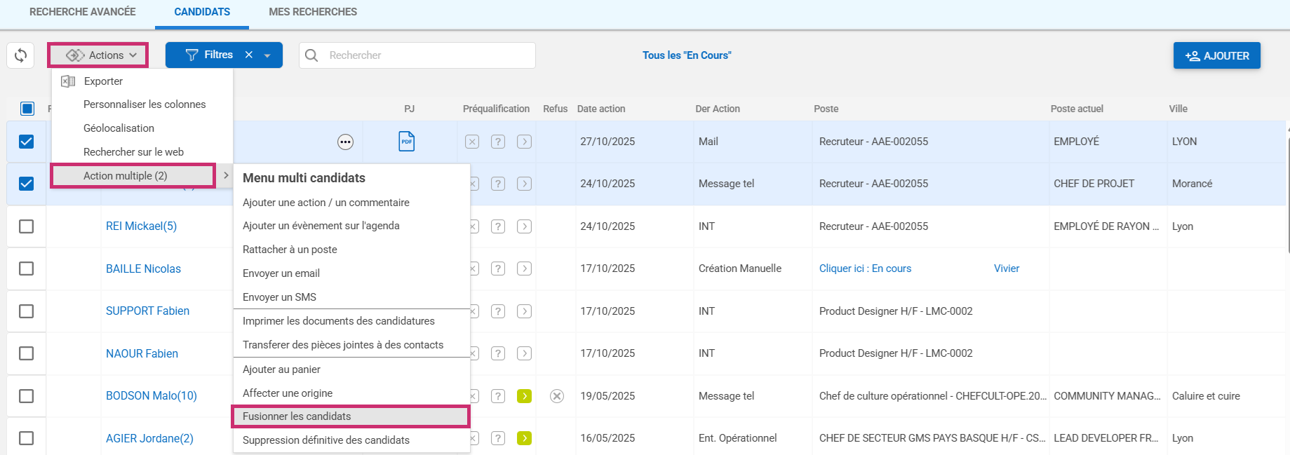 Pour consulter les candidatures fusionnées vous cliquez sur la fiche candidat conservée puis vous cliquez sur l’onglet « Pièces Jointes », vous pouvez aussi consulter les suivis des actions des candidats fusionnés dans la partie « Suivi des actions ».
