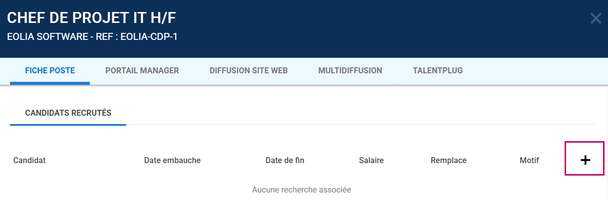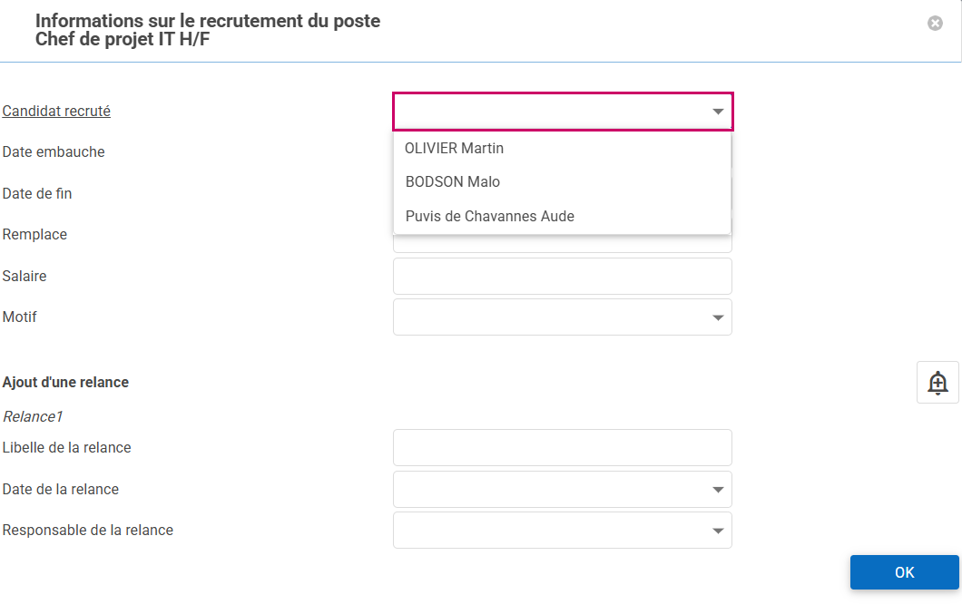 Le candidat recruté n’apparaît pas quand vous voulez l’ajouter en tant que « Candidat recruté » au niveau de la fiche de poste.