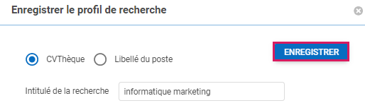 Ensuite vous cochez le bouton CVthèque ou Libellé du poste, et vous renseignez la case Intitulé de la recherche, puis vous cliquez sur le bouton Enregistrer :