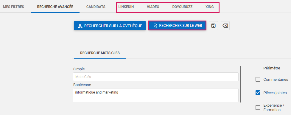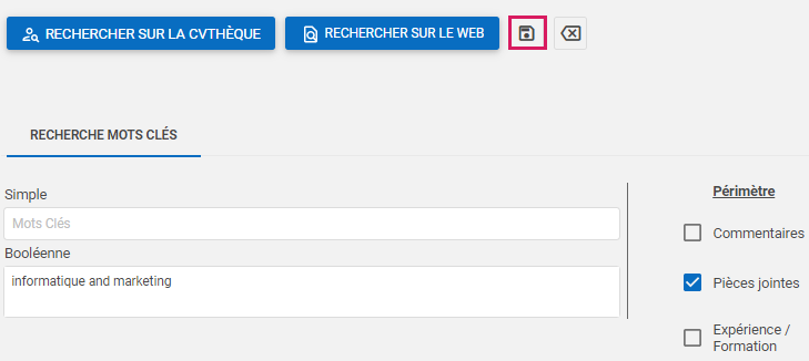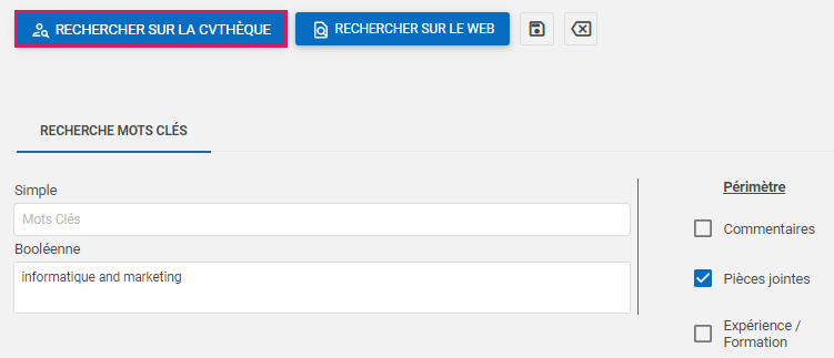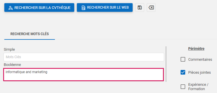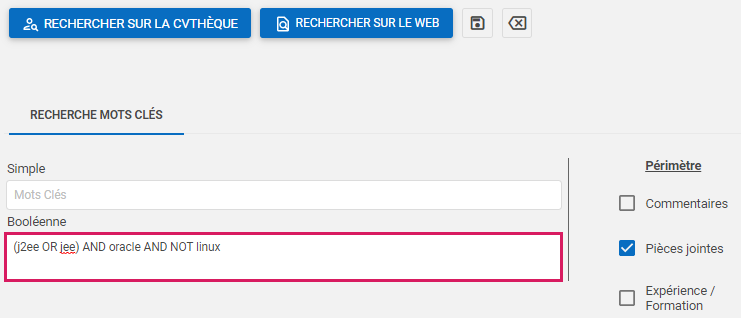 - Comme pour la recherche par mots clés, vous pouvez sélectionner votre périmètre de recherche : Commentaires, Pièces jointes, ou Expérience/Formation