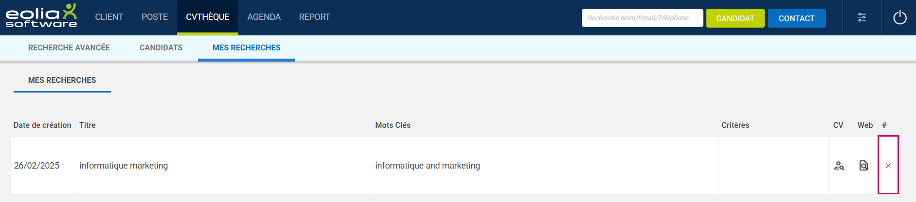 Pour supprimer une recherche, vous cliquez sur le bouton x affiché :