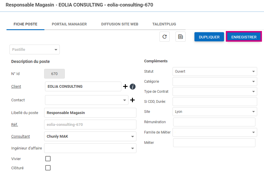 Pour modifier une Fiche de Poste, vous cliquez sur le poste et vous modifiez les champs souhaités, puis vous cliquez sur le bouton Enregistrer :