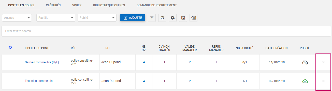 Pour supprimer une Fiche de Poste, vous cliquez sur le bouton x affiché sur la page d’écran :