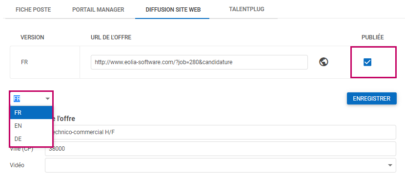 Si votre espace candidat est paramétré en plusieurs langues, vous pouvez choisir la langue FR/EN/DE pour saisir votre annonce dans les différentes langues.