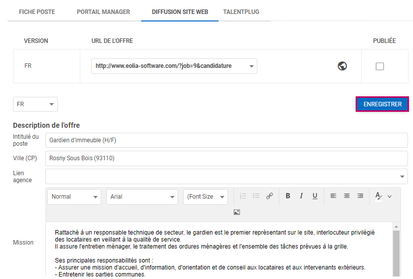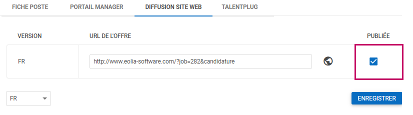 L’onglet Diffusion site web permet de publier ou dépublier votre offre sur votre espace carrière.