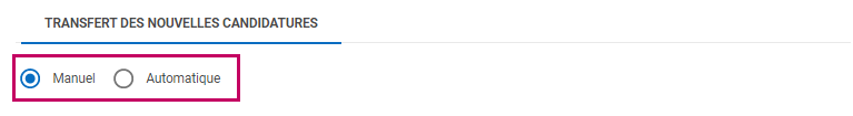 • Manuel : les candidatures seront envoyées dans le Portail recruteur et rattachées au poste dont est affecté le RH pour effectuer une première qualification, puis les candidatures pré-qualifiées seront envoyées au Manager pour une deuxième qualification (Envoyer une candidature à un Manager).