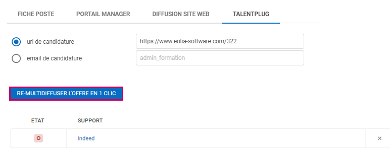 • Vous pouvez re-multidiffuser en 1 clic votre offre si elle a été déjà diffusée, il suffit de cliquer sur le bouton Re-multidiffuser l’offre en 1 clic.