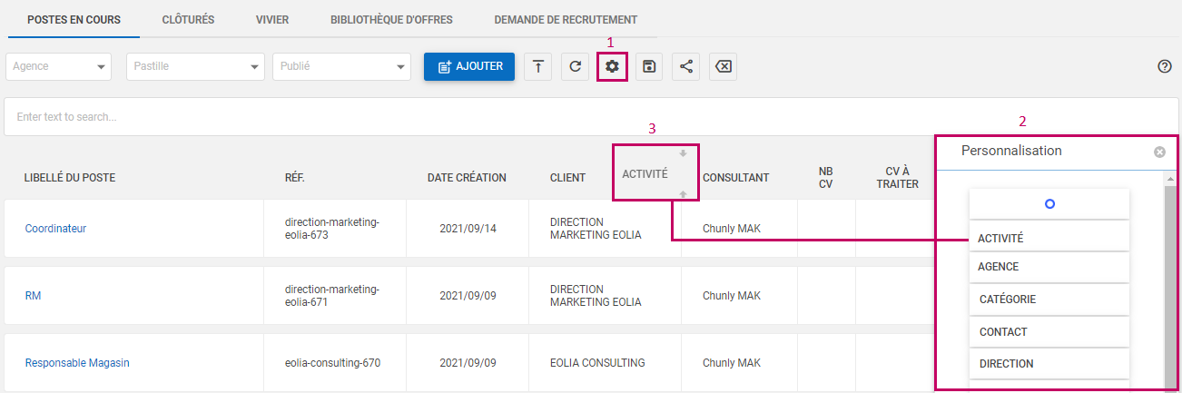 Vous pouvez personnaliser toutes les colonnes en cliquant sur le bouton , le tableau de personnalisation va s’ouvrir tout à droite, ainsi vous pouvez :