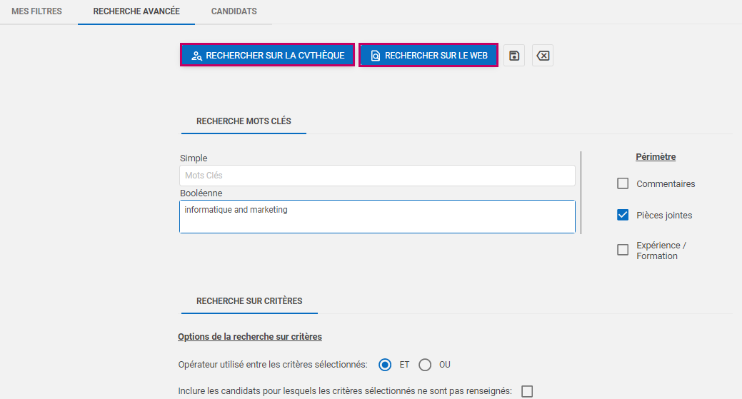 - Cliquer sur le bouton Rechercher sur la CVthèque ou Rechercher sur le Web.