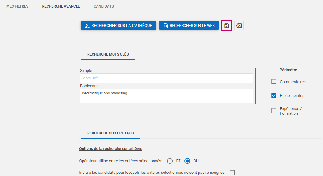 Pour enregistrer une recherche des candidatures par critère :
