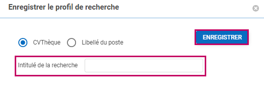 Si vous cochez le bouton Libellé du poste ensuite vous renseignez l’intitulé de la recherche et vous sélectionnez un poste, votre recherche sera enregistrée sur la fiche de poste que vous avez sélectionnée dans la partie Recherches Candidats. Si vous cochez le bouton CVThèque, votre recherche sera enregistrée dans l’onglet « MES FILTRES » du module CVTHEQUE.