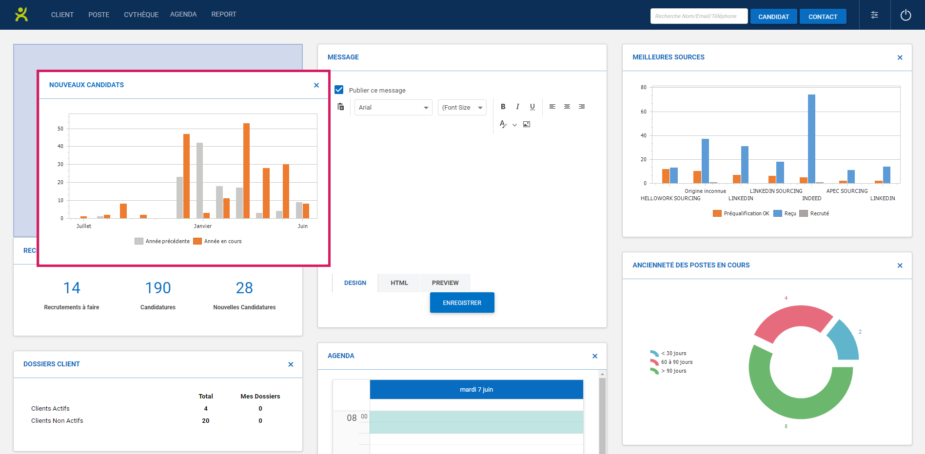 - « Nouvelles Candidatures » correspond au nombre de nouvelles candidatures sans pré-qualification rattachées à tous les postes en cours.